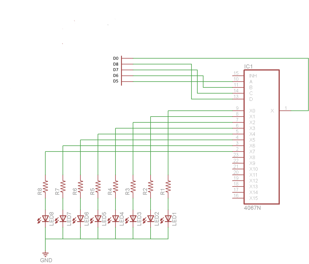 Here is a schematic, in this example we only connected 8 sets of LEDs and resistors but its easy to add another 8 from X8 to X15