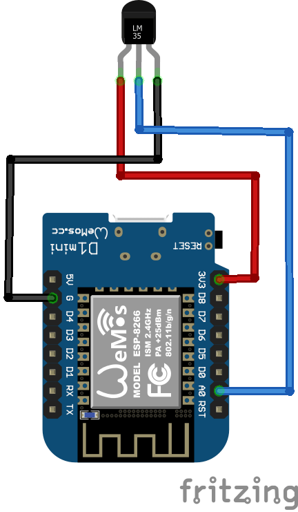 Very simple to connect Vcc is 3v3, Gnd is any Gnd and out goes to Wemos Mini A0, you can see this below