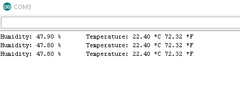 Open the serial monitor with Ctrl+Shift M or Tools->Serial Monitor, and you should see the values for the humidity in percent as well as the temperature & heat index in Celcius and Fahrenheit. Here is my hardware running